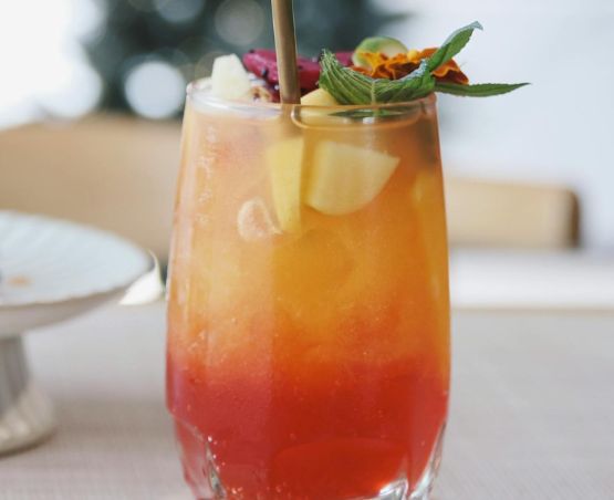 Fruitige accenten - Voeg een schijfje sinaasappel of een partje perzik toe aan de rand van het glas. Dit voegt niet alleen een kleurrijk en smakelijk accent toe, maar past ook perfect bij de fruitige smaken van de cocktail.
